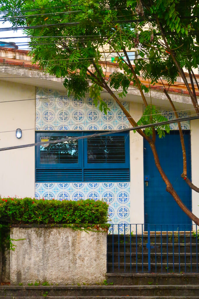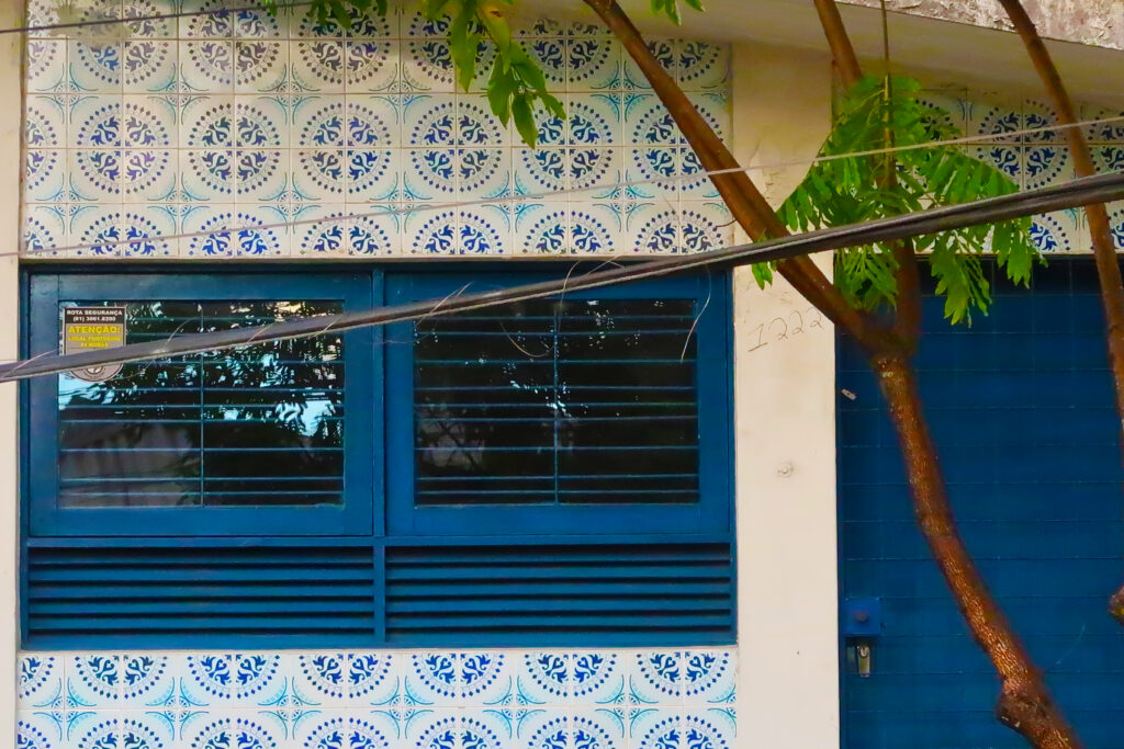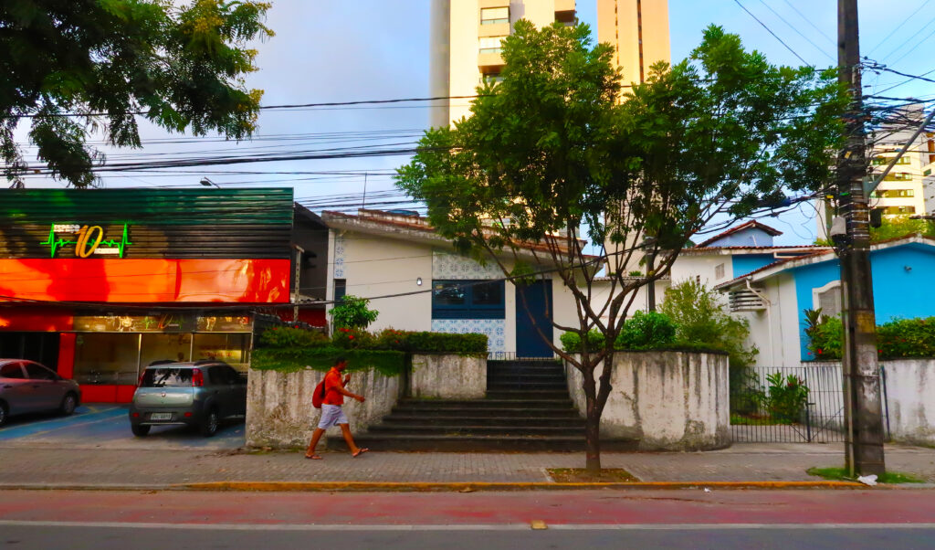 Uma casa que tá lá ali, exposta, de murinho baixo para uma rua. Passam ônibus, passam bicicletas nesta rua. Passam pessoas caminhando rápido, passam motoqueiras com entregas perigosamente apressadas. A casa ainda está ali, face a face com uma rua que parece viver outra velocidade. Tudo que a distancia é um portãozinho azul e uma escadinha lateral. Umas venezianas e umas flores com espinhos. Luz acesa, jardim aparado. Mora alguém ali. Mas, talvez pela brutalidade da velocidade do hoje, quem mora não se sente mais à vontade de se sentar no alpendre. Quem passa atento, consegue ainda pescar a beleza da casinha de uma água só e várias cerâmicas geométricas na fachada. Aqui fica nosso registro da sua presença e resistência em ainda ocupar, vastamente, a cidade.